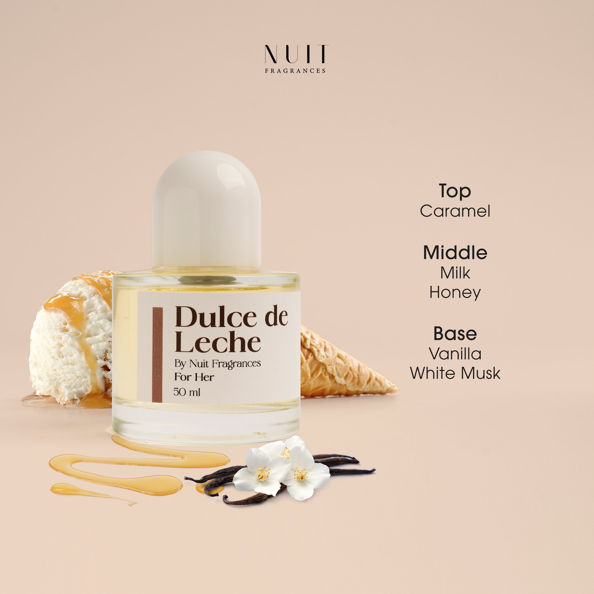 A delectably sweet fragrance with notes of caramel, honey, and creamy milk, accentuated by smooth vanilla and white musk. This fragrance exudes warmth and comfort, ideal for adding a touch of sweetness to any moment.